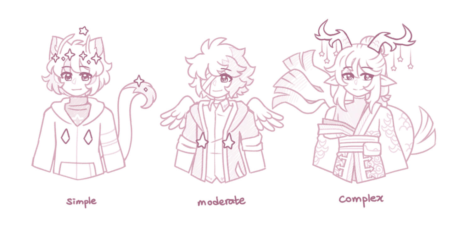 ✧ You can avoid the extra charge by providing clear visual references (real pictures, in-game screenshots or drawn). Eg: shoes, pants, hairstyle, etc.
